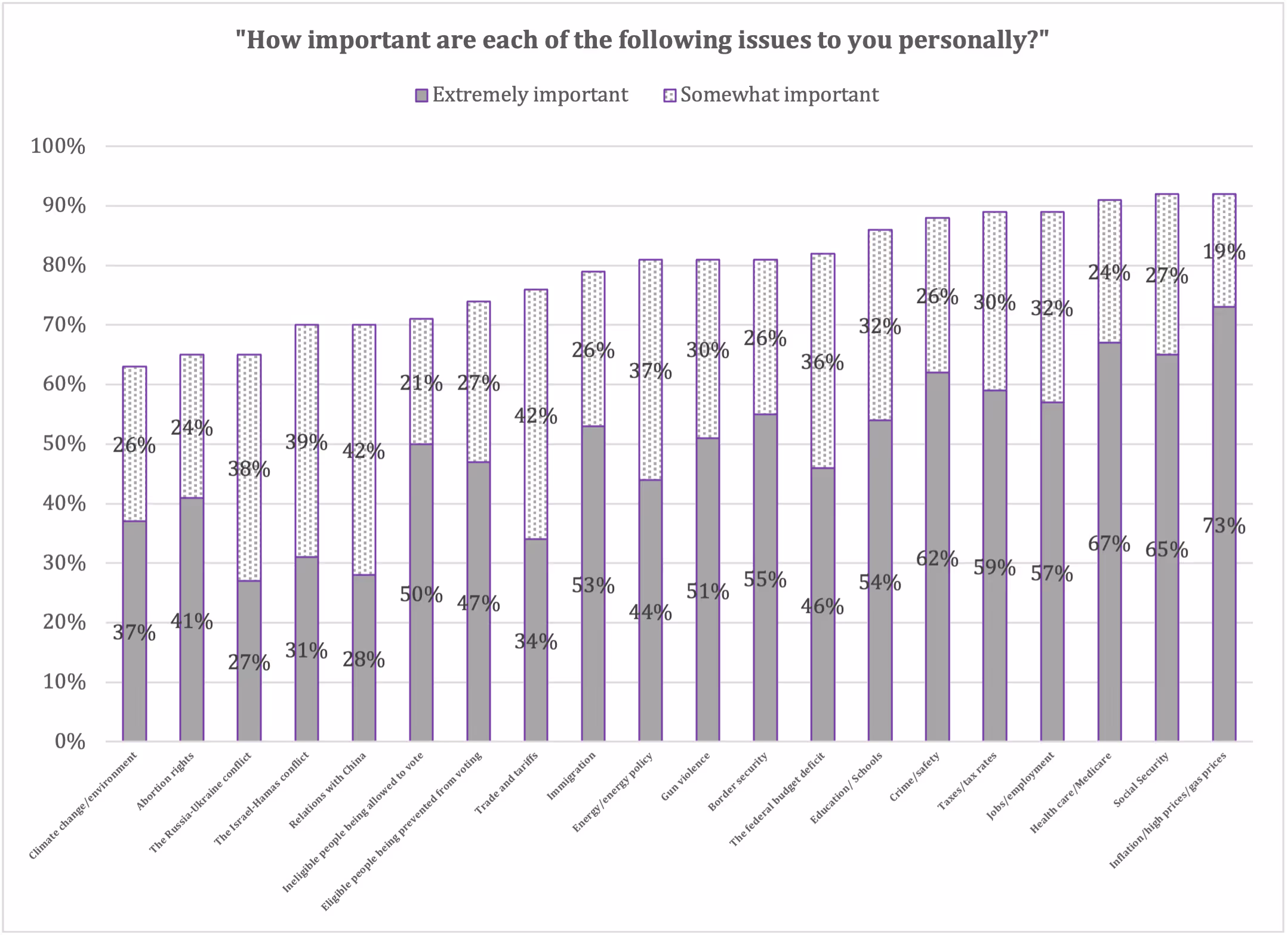 Harris’ top two issues—climate change and abortion—were judged as “extremely” or “very” important personally by 63% and 65% of voters; that seems impressive, but these were the two lowest scoring issues that we tested.