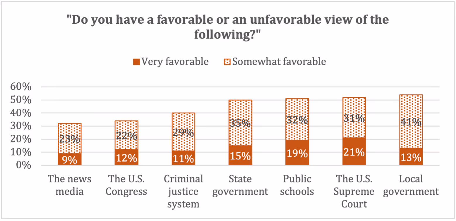 Beyond the “track” question, evidence that voters are dissatisfied with the country’s direction is apparent in ratings of American institutions. When asked whether they have favorable or unfavorable feelings towards various governmental and public entities, Americans were (at best) ambivalent. The Supreme Court, for example, is viewed favorably by 52% of respondents, with 21% saying they are “very” favorably inclined. Local government also fares relatively well, garnering favorable feelings from 54% of the public (13% “very” favorable). But only 31% feel favorable towards the news media (9% “very” favorable), and the ratings for the Congress (34% favorable) and the criminal justice system (40% favorable) are likewise under 50%.
