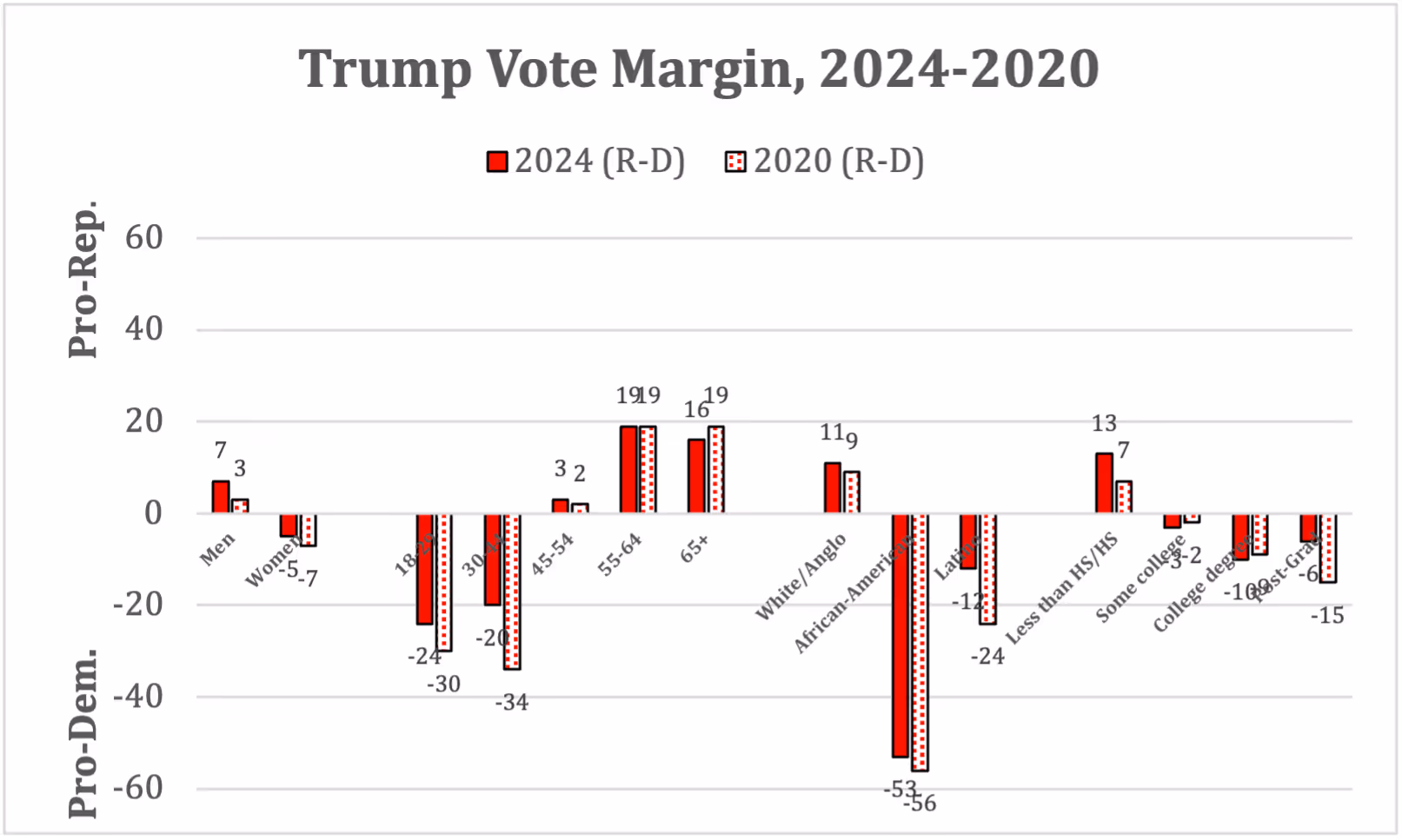 In 2024, Trump carried white voters by eleven points and lost Black and Hispanics voters by fifty-three and twelve points, respectively. Compared to 2020, Trump improved his margin among white voters by two points, among Blacks voters by three points, and among Hispanic voters by twelve points.
