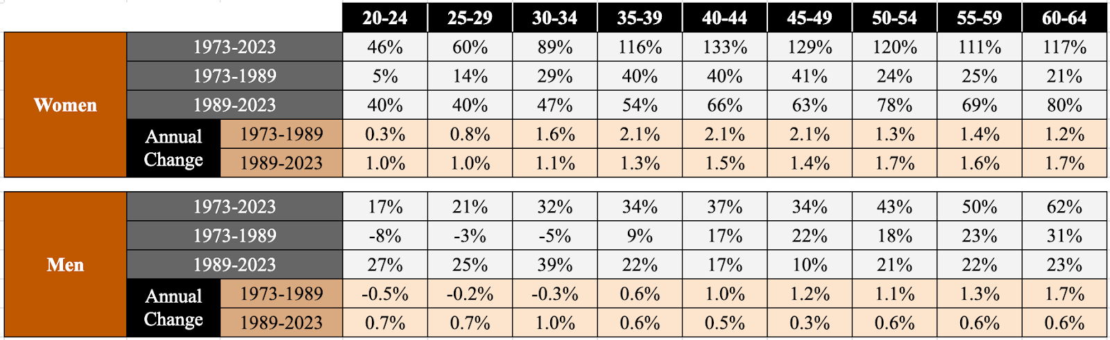 Interesting patterns emerge when we examine the 1973-1989 and 1989-2023 periods separately. Since the two periods differ in length, it’s more informative to examine the annual percentage changes, which are also shown in Table 3. Among women, earnings rose faster after 1989 than before for the youngest and oldest workers. Women aged 30 to 49 saw larger gains from 1973 to 1989, likely reflecting increased work and career opportunities for mothers with older children.