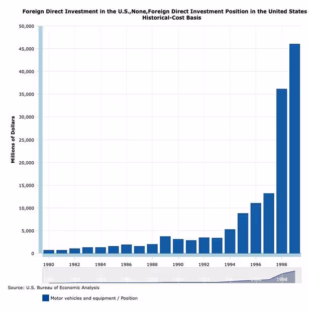 We can see this most clearly by examining the Bureau of Economic Analysis data on foreign investment in the “motor vehicle and equipment” sectors. In 1981, that figure was about $652 million. By the time the VER ended in 1994, that figure was $5.3 billion - a 713 percent increase over the years of the VER. However, in the five years after the VER ended, foreign investment in this sector increased by another 770% (to a staggering $46.1 billion) in 1999. Two major factors contributed to the increased foreign investment in 1994: the end of the VER and the “Republican Revolution,” whereby then-US President Bill Clinton had to contend with a Republican Congress. One issue where both parties agreed on was trade liberalization. As international trade became more liberalized, foreign investments poured into the US.