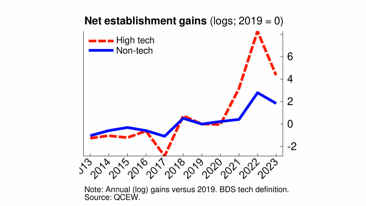 I've divided these narrow industries into high-tech or non-tech. In this case, we are looking at how STEM intensive this industry’s employment is. Is this an industry that employs a lot of high-tech type people? If it is, we will call them tech. These high-tech industries saw an enormous increase in net establishment creation during the pandemic. In 2022, the net establishment entry rate was about eight percentage points higher than the pre-pandemic norm. And the pre-pandemic norm for high-tech was something like four percent a year. It is quite striking. Now, if I had shown you this chart without the tech line and only the blue line—the non-tech industries—you would have found that striking too. In fact, we have seen a large increase in establishment formation in non-tech industries as well. But the tech surge is much larger.