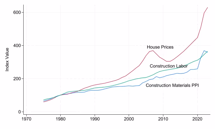 One potential explanation is rising materials or labor costs. While these costs have certainly increased, they have not kept pace with the rapid rise in housing prices (see Figure 1). What, then, is driving this growing gap?