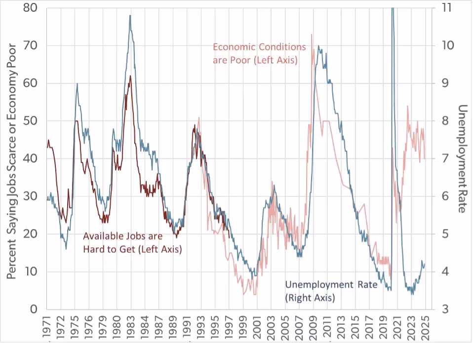 Source: Tabulation of Gallup data (economic conditions) from https://news.gallup.com/poll/1609/consumer-views-economy.aspx, data from the Conference Board (available jobs) from the Roper Center for Public Opinion Research’s iPoll website (https://ropercenter.cornell.edu/ipoll), and data from the Bureau of Labor Statistics (unemployment rate) from https://www.bls.gov/cps/data.htm.