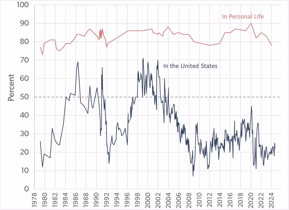Figure 1. Trends in Satisfaction with the Way Things Are Going in the Country and in Personal Life, 1979-2024