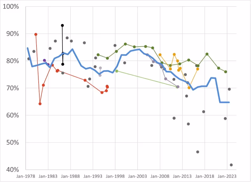 A second observation is that the trend is downward. This conclusion is somewhat more ambiguous than it might seem, given that the points are not necessarily comparable. For example, we don’t have similar 1978 estimates for those stand-alone points below the 70 percent line after 2010; if we did, they might indicate levels below 70 percent even in 1978. The eye is also drawn to those outlier points even though the average of all the data points since 2010 is 71 percent.