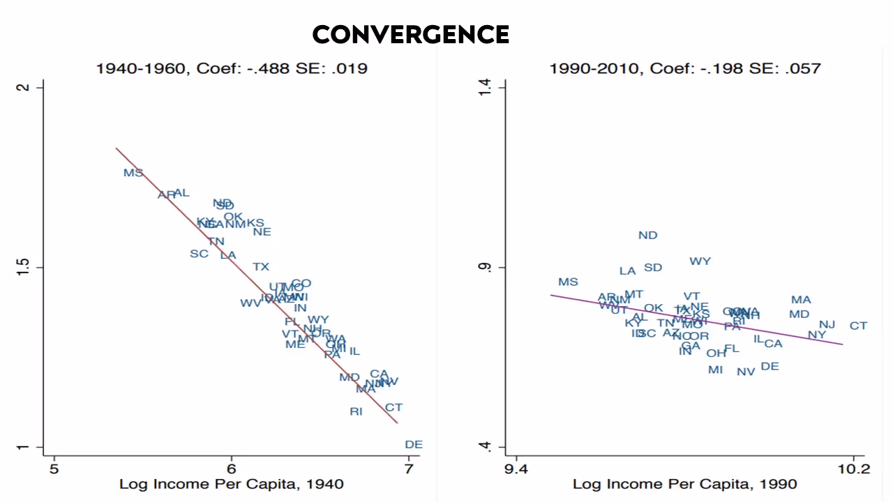 Moving beyond local affects, we see that housing regulations also affect national economic patterns. Consider the concept of convergence, where poorer states historically grew faster than richer ones, gradually closing the income gap.