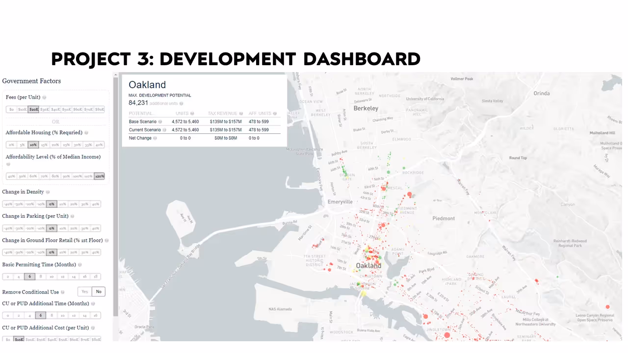 The last project I want to talk to you about is how we can take academic work on regulations and create concrete tie-ins to development. Sometimes researchers invent measures of regulation, like land use cases, that are not helpful. Measuring regulation in this way means nothing to a developer who thinks in terms of floor area ratio, parking requirements, setbacks, maximum height, etc. Academic researchers often take regressions of individual rules and look at statistical relationships between them. That is not always helpful because there are many kinds of complicated interactions between them. Increasing a building’s maximum height requirement without changing the floor to area ratio means that the original change will have no effect. Or changing the floor area ratio but make the change in a location where there is little demand could also have no effect.