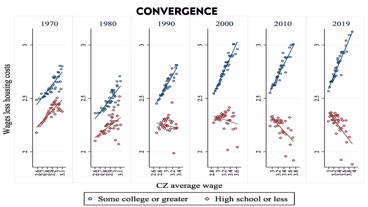 Think about a state with high wages and scarce labor. Then think about another state where wages are low. There are big returns for both high and low skilled workers if they move to the states with high wages and scarce labor. That migration should equilibrate levels. If you have one place with high skill levels, and one place where people have less education, and people can move around, you'll get convergence. If you have one pot of hot water, one pot of cold water, and people are free to move around, both pots converge towards each other. Directed migration could have been an important part of generating this convergence story. Then what happens when we stop building in the country’s rich, productive areas? What happens when this regime of land use regulations starts restricting supply?