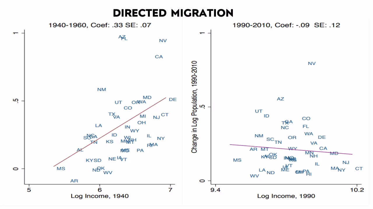 This is directed migration where people are moving to the richest parts of the country. Here is where we were in the more recent period where that is not happening. We have divided postwar U.S. history into two periods: a period where people are moving to the richest parts of the country, convergence happens, and the poor states catch up to the rich states. Then in the more recent period, both of those trends slow, or even disappear. And the question is, why? This paper links these trends to a change in the way we build or the change in housing prices and regulations.