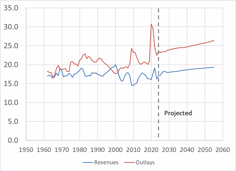 Across the forty years between 1962 and 2001, federal spending averaged 19.8 percent of gross domestic product (GDP) while revenues were 17.7 percent. After 2001, however, spending rose by much more than revenues fell. By 2024, revenues were still 17.1 percent of GDP, but outlays were 23.4 percent. With unemployment averaging an impressively low 4.0 percent last year, federal spending reached levels unseen in the modern era except during the deep recession years of 2009 and 2020 and the inflation-spawning Biden years of 2021 and 2022.