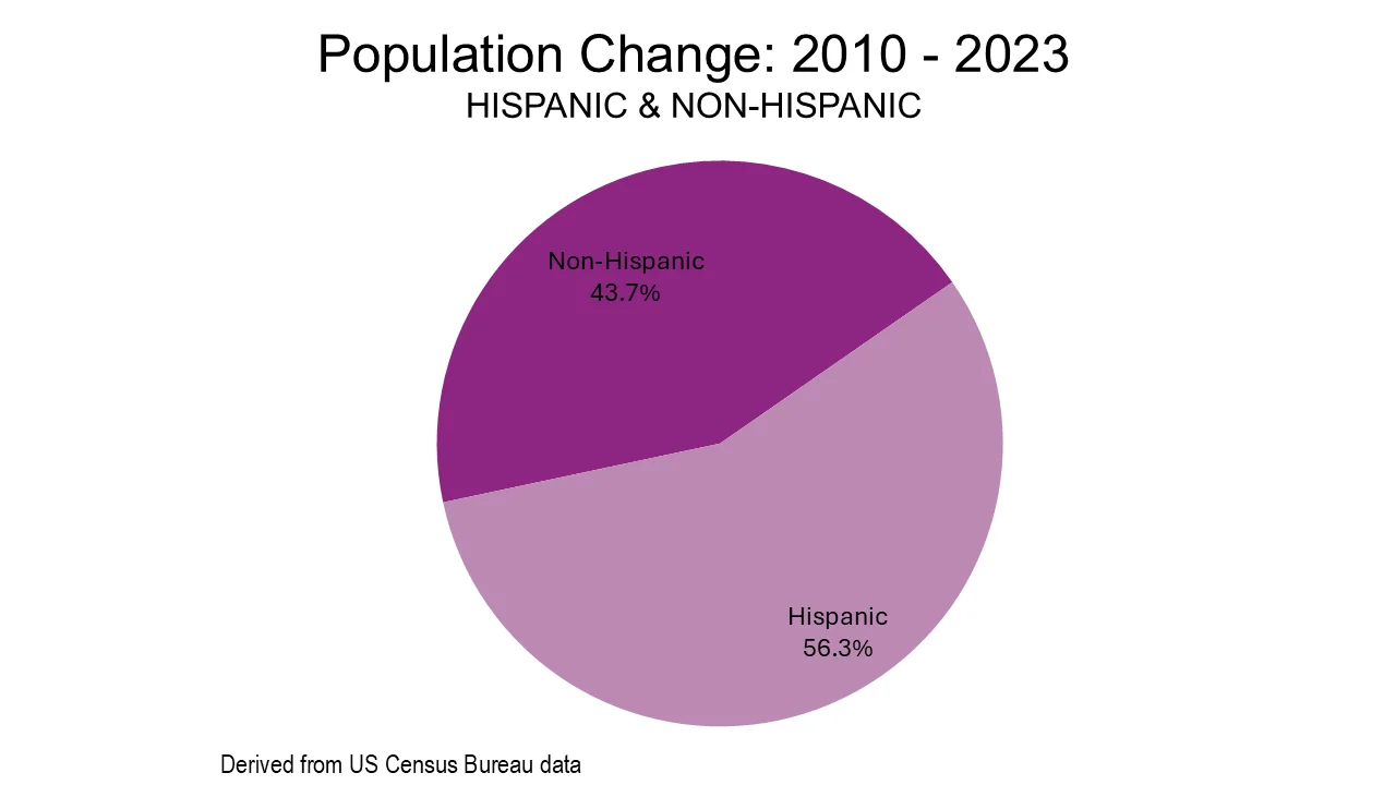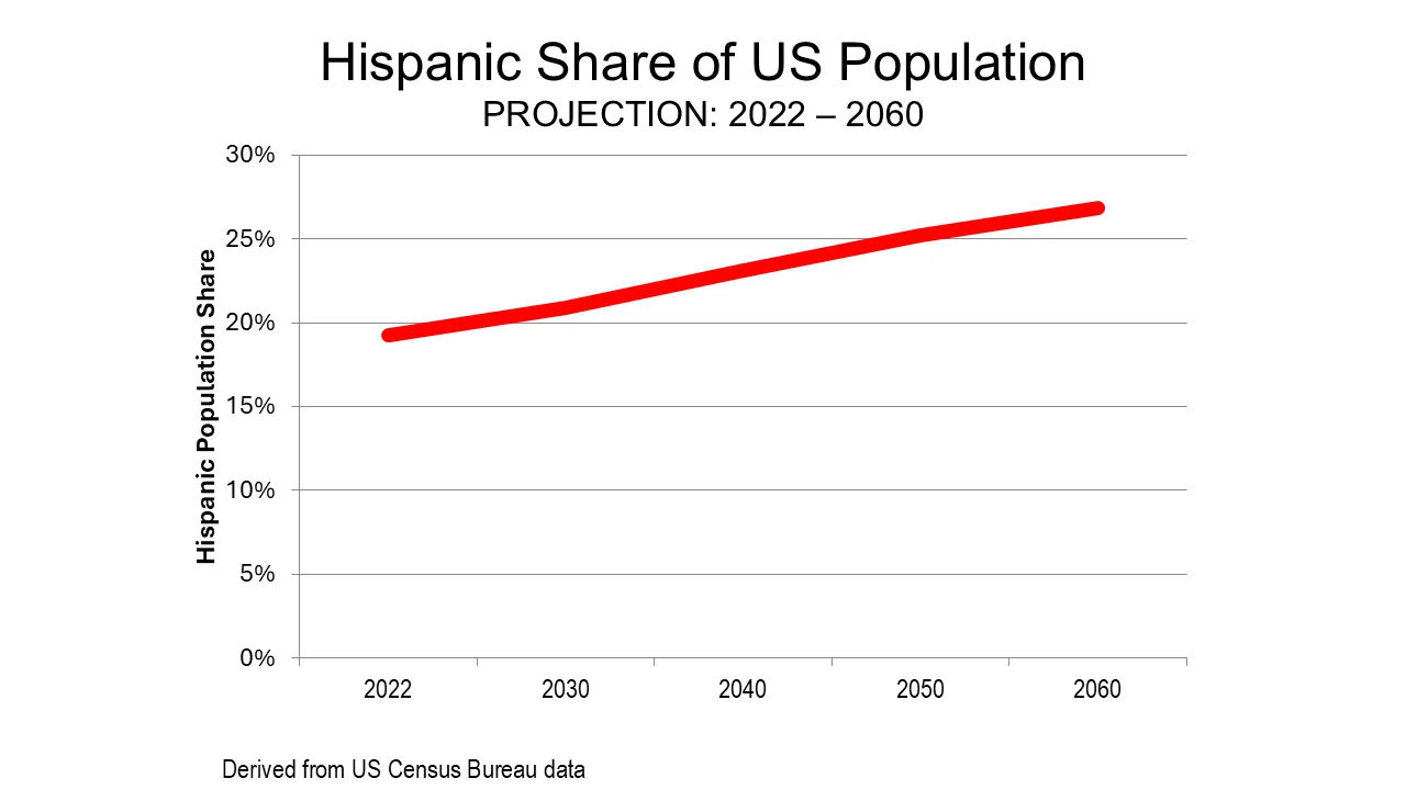 The demographic evidence is overwhelming. Since 1970, Latinos have increased from 5% of the total U.S. population to approximately 20% in 2023. Between 2010 and 2023, Latinos accounted for 56.3% of the total U.S. population growth. The Census Bureau’s most recent population projections expect the Latino population to expand by approximately 31 million between 2025 and 2060. In contrast, the total U.S. population is projected to grow by only about 26 million, while the non-Latino white population is projected to decline by 32 million. These numbers show that net population growth over the next forty years will be primarily Latino.