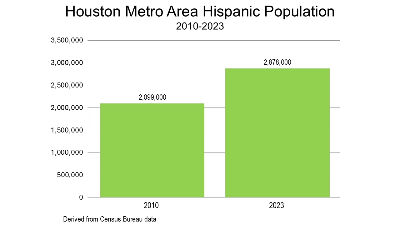 In 1960, Harris County, which includes Houston, was barely 10% Latino. Today that percentage is four times higher. Patrick Jankowski, former chief economist for the Greater Houston Economic Partnership, notes that the past decade has seen the area add over one million people, the majority of them Latino and barely one-tenth Anglo.