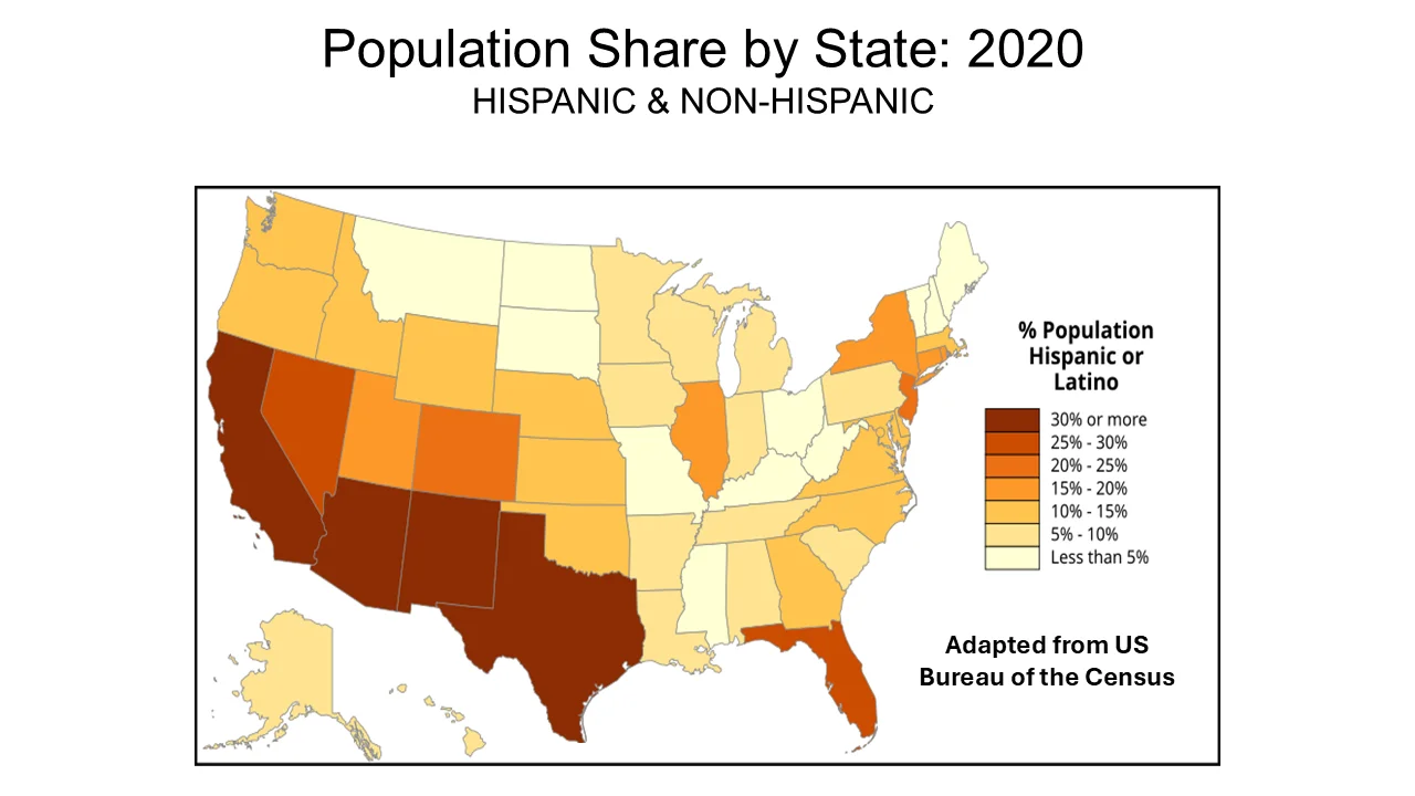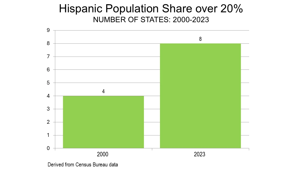 Gradually, a more national paradigm is replacing the old Southwest one. Latinos in 2000 were more than 20% of the population in four states. Today they are more than 20% in eight states, and by 2030, the Census Bureau projects that Latinos will account for 22% of the national population.