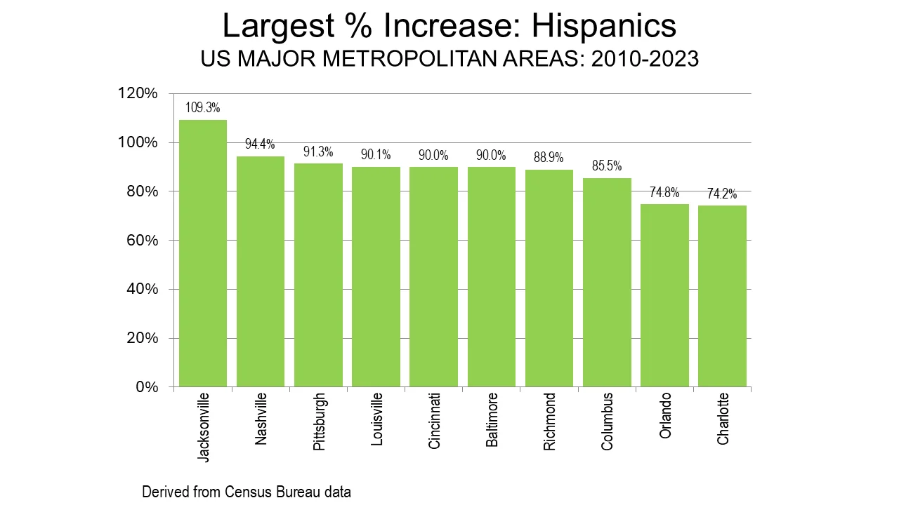 Latinos now favor smaller metropolitan areas like Pittsburgh, Cincinnati, Richmond, Jacksonville, and Columbus. They are transforming even the most iconic traditionally Anglo areas. We can see this even in Nashville, America’s country music capital. As recently as 2000, less than 3% of metro Nashville’s population was Latino, but by 2020, that percentage had more than tripled.