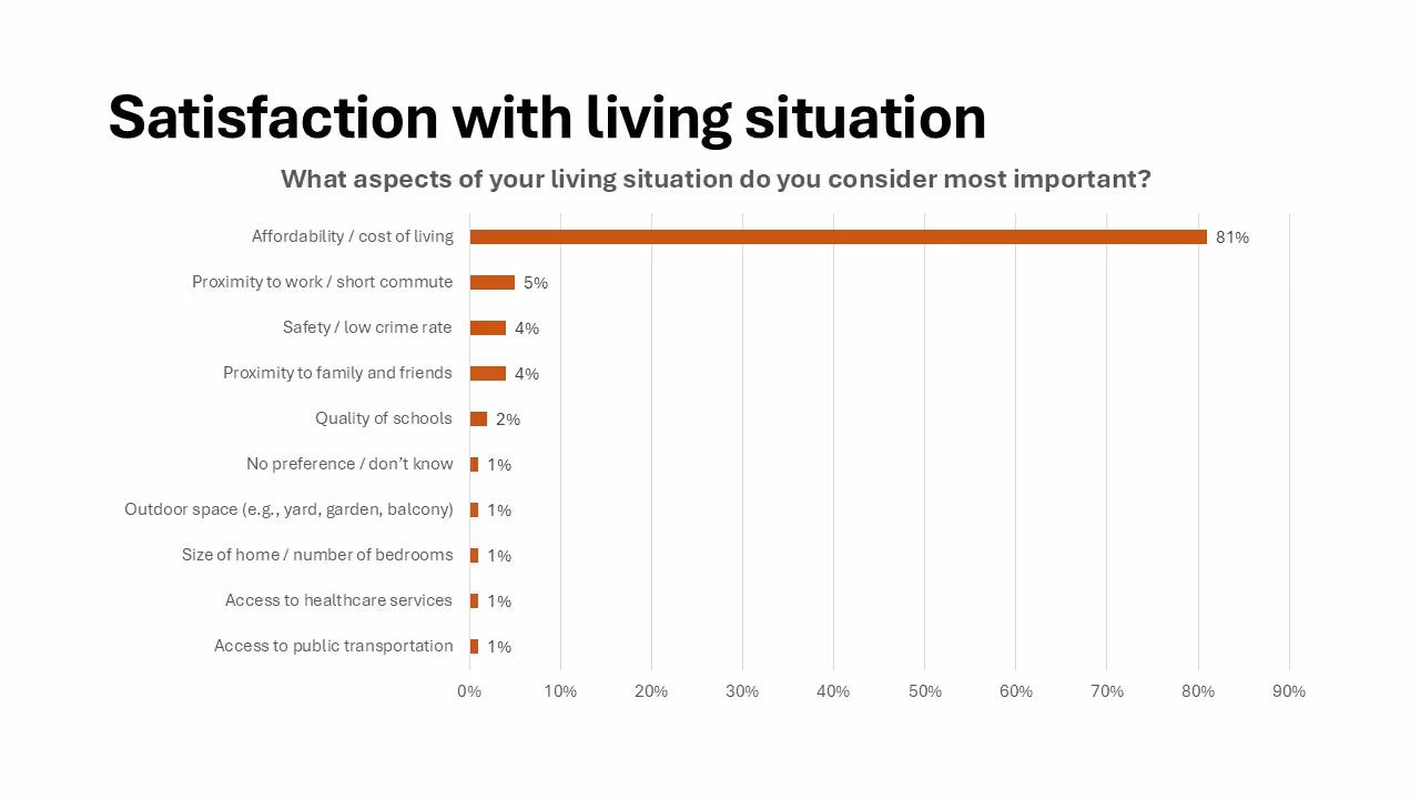 Latinos, like nearly all Americans, want to own single-family homes, in part to accommodate children, but also because homeowners have forty times the net worth of renter households.lxxxiv Housing is the largest cost of living component; our survey showed Latinos ranking it their highest concern, and most currently live in single family homes although many still rent.